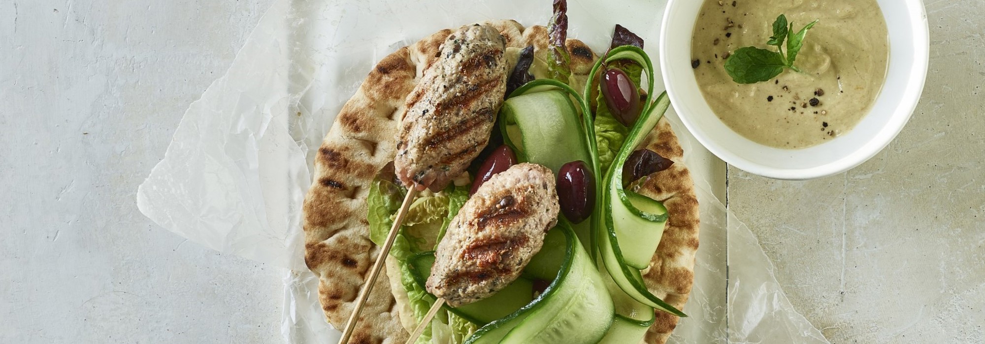 SMÅ GRILLSPYD PÅ FLADBRØD MED HUMUS OG GRØNT