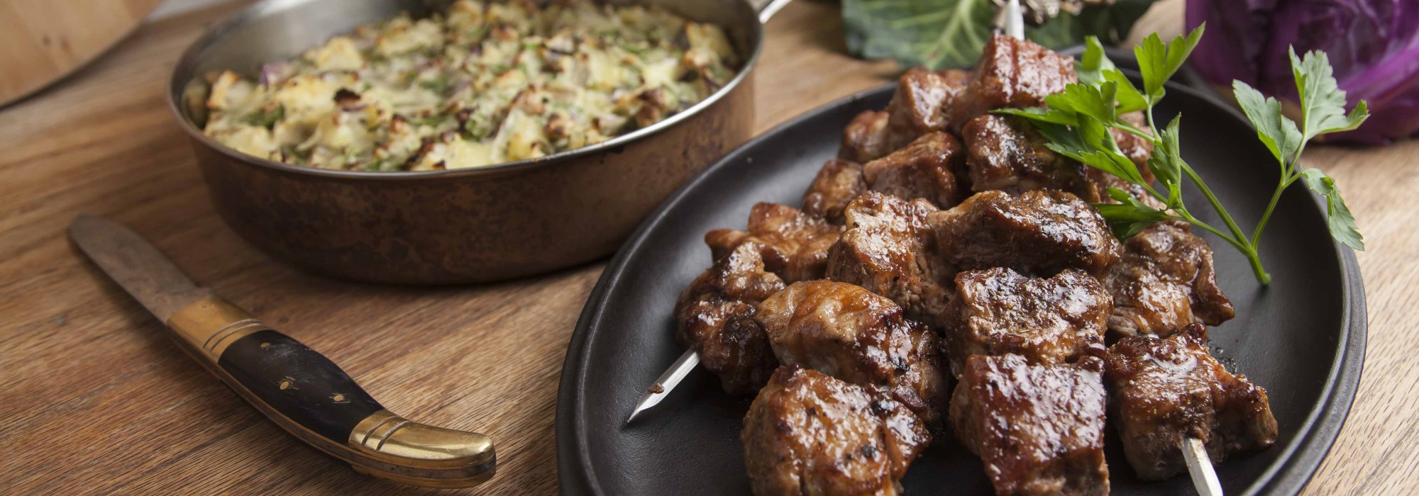 Mens kartoflerne er i ovnen, brunes kødet af på en varm pande med lidt olivenolie. Fordel derefter ternene på fire spyd. Pensl kødet med resten af marinaden. Spyddene steges færdig i ovnen i ca. 10 minutter. Servér spyddene straks sammen med de varme, knuste kartofler.
