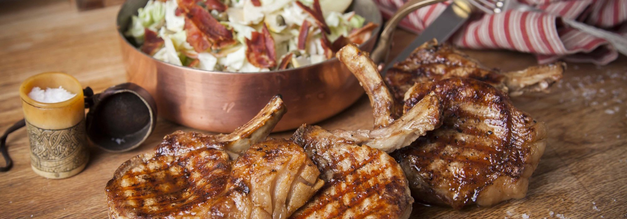 Anret koteletterne på tallerkener med salaten og knus baconen herover.