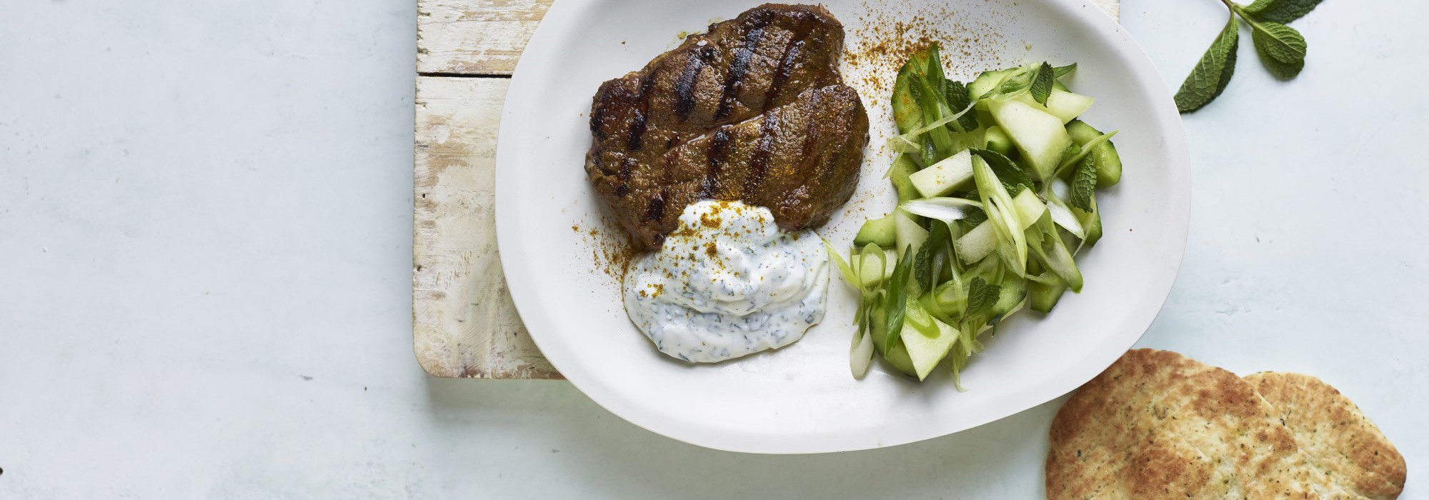- Servér salaten og mynteyoghurten til kødet evt. suppleret med ris eller naanbrød.
